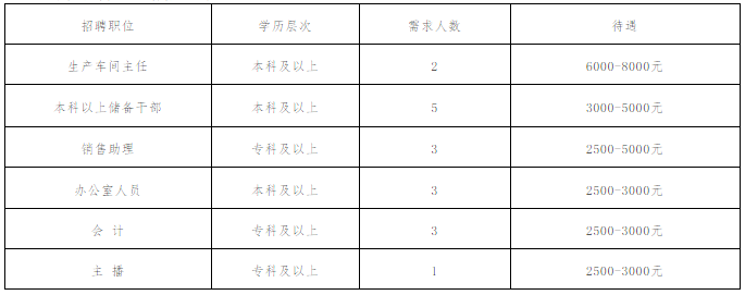 以上人员一经录用,待遇从优,公司提供免费食宿、班车接缴纳五险一金、工龄补贴、保底工资,有意者请携带毕业证等相关证件原件至公司二楼行政部面试。