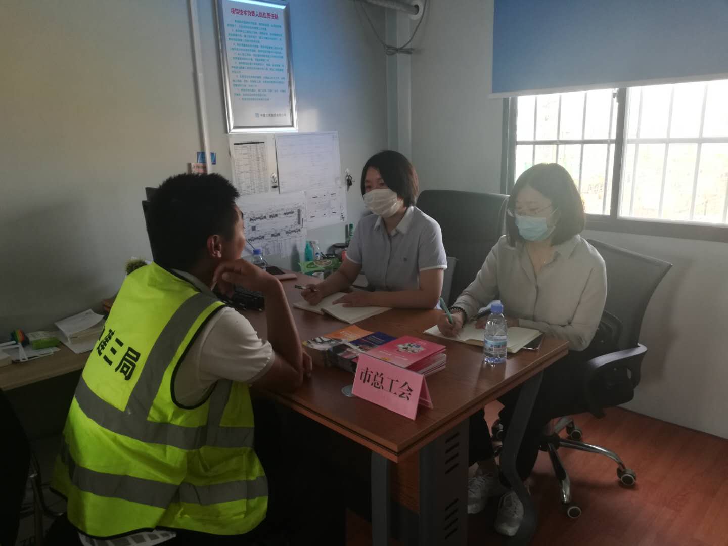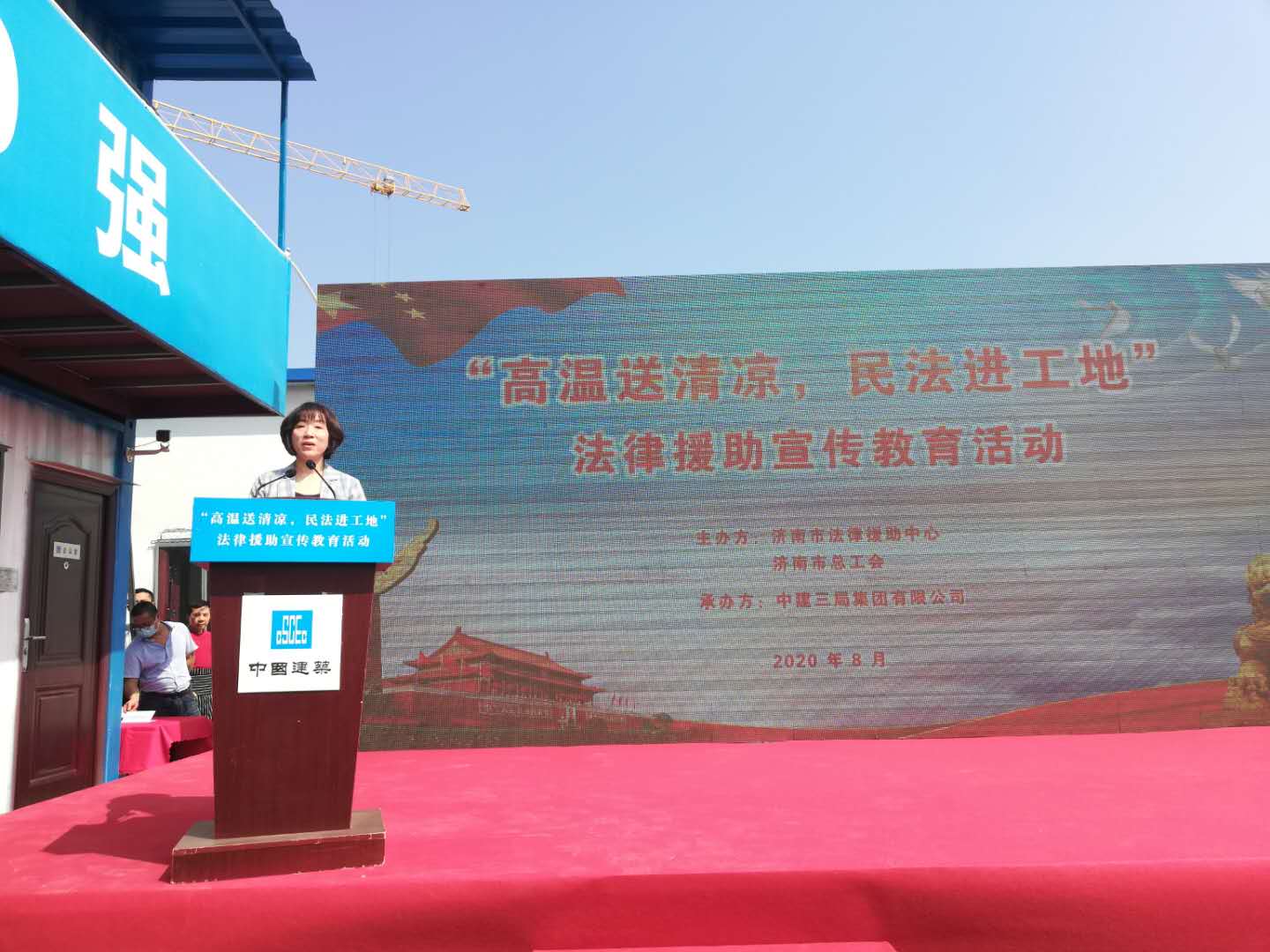8月28日上午,市总工会与市法律援助中心在中建三局集团有限公司(山东)王府水屯项目工地举办“高温送清凉,民法进工地”普法宣传活动。市司法局二级巡视员王翠香、市总工会副主席方静、市法律援助中心主任孙彦华、中建三局集团有限公司山东公司执行总经理迟振涛等出席活动。