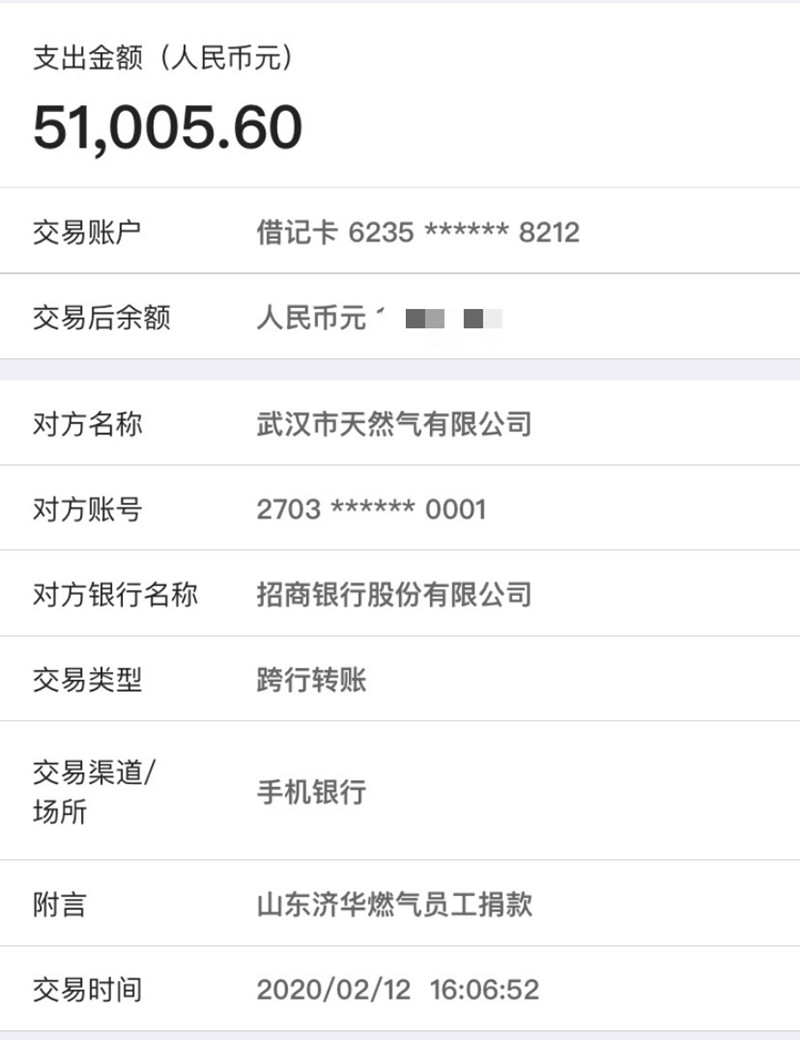疫情无情,济华有爱。本次捐款活动得到广大干部职工的积极响应参与。为避免人员聚集,本次捐款活动没有组织集中现场捐款,主要采取电子转账的方式进行捐赠。为期三天的捐款,共计451名员工捐款51055.6元,所捐款项已统一转至武汉天然气有限公司账户,为主战场中的兄弟企业贡献一份力量。