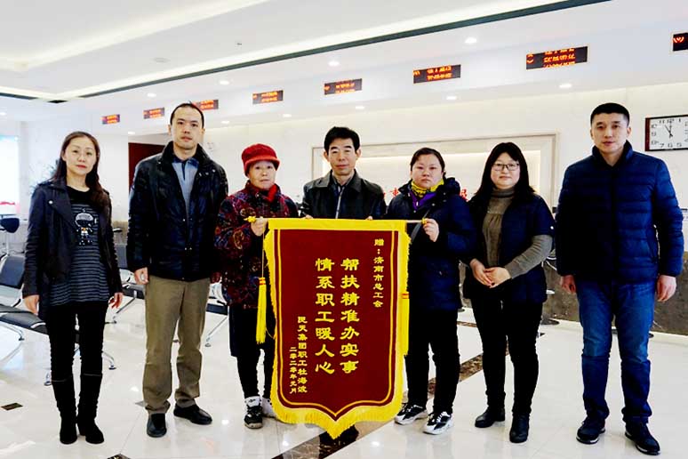 1月17日上午,济南市民天面粉有限责任公司患病困难职工家属将一面印有“帮扶精准办实事,情系职工暖人心”的锦旗送到济南市职工服务中心,感谢市总工会对困难职工家庭的关怀与帮助。市职工服务中心也向困难职工赠送了春联和“福”字,祝愿职工能早日康复。