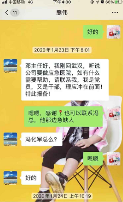 腊月二十九晚上八点,熊伟刚下飞机,再得知公司即将建设火神山医院这一消息后,未等到回到家中,就主动向公司领导请缨作战,但因建设所需人员尚未明确,一时并未得到准确回复。经过一晚上的焦灼等待,大年三十一早,熊伟瞒着家人独自一人前往火神山医院现场,并再次向领导请缨,“我是一名党员,也是一名武汉人,有责任也有义务站在施工一线,这是我必须要做的事情!”再得到侯董事长准许后,当日便告别家人,面对老婆及孩子的挽留,熊伟留不下太多的时间解释,毅然前往一线。