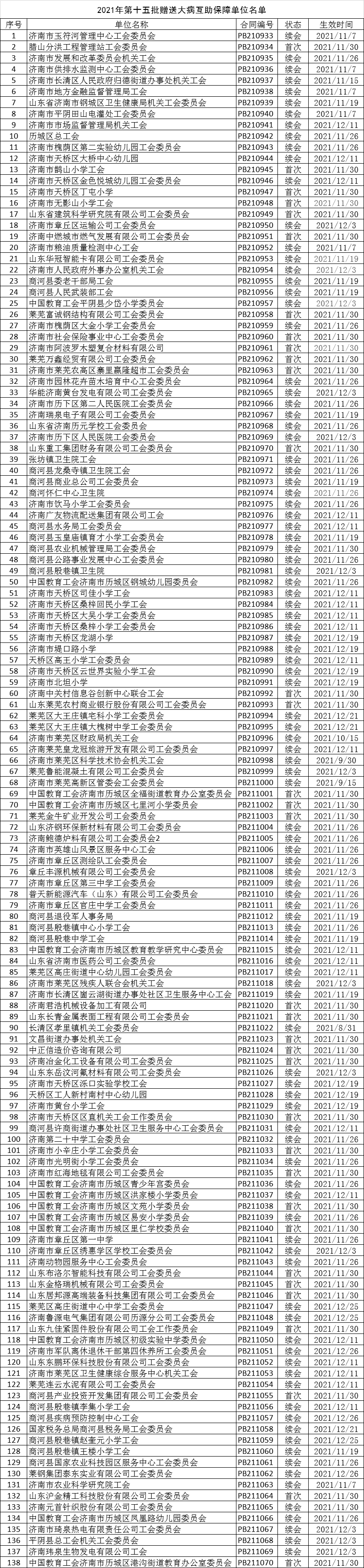 各基层单位: 市总工会2021年第十五批赠送的大病互助保障单位名单公布如下(详见附件),请及时关注查看详细信息。 备注:以下单位的会员可登录齐鲁工惠APP-互助保障-保单查询模块查看保单信息。 济南市总工会 2021年12月1日