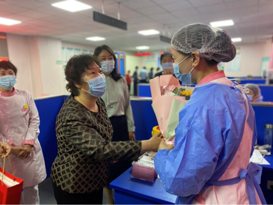 魏丽一行听取了社区卫生服务中心新冠疫苗接种工作开展情况的汇报,为接种岗位上的职工送上鲜花和慰问品;并与医护工作人员亲切交谈,对社区卫生服务中心作所做的工作给予充分肯定,向接种一线岗位的医务人员致以崇高敬意和亲切问候,并希望大家在做好疫情防控工作的同时,注意自身的防护,更好的为人民群众提供安全、优质、便捷的医疗卫生服务。