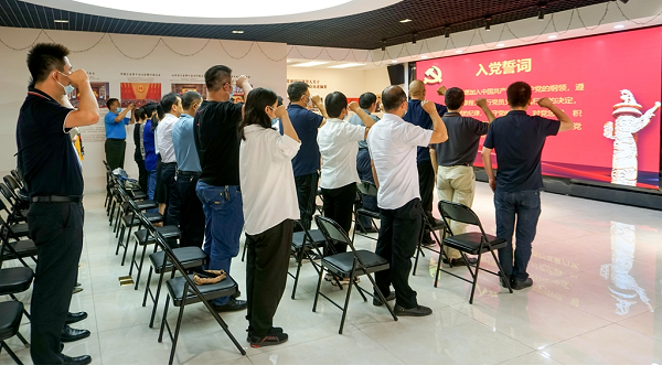 “我志愿加入中国共产党,拥护党的纲领,遵守党的章程,履行党员义务,执行党的决定……”全体党员佩戴党员徽章,面对鲜红的党旗,庄重地重温了入党誓词,再一次庄严地作出对党的承诺,坚定理想信念、不忘初心,庄严宣誓志愿为党的事业奉献终身。