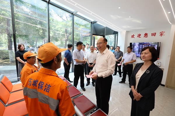 在历城区全福立交桥户外劳动者驿站,王京文与环卫工人、驿站管理人员详细交谈,了解驿站管理运行情况,询问他们的需求。该处户外劳动者驿站面积达300余平方米,自2019年建成以来,组织开展形式多样的志愿服务活动,使环卫工人、交通警察、快递员等户外劳动者享受工会的周到服务,2020年被省总工会授予“山东省工会户外劳动者驿站示范点”。