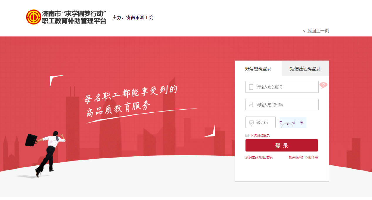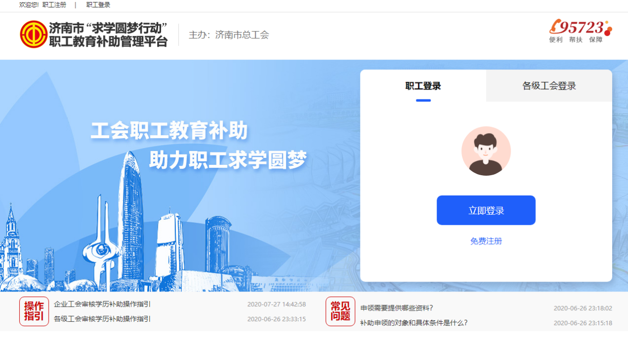 第一步:注册登录。符合条件的职工本人登录济南市“求学圆梦行动”职工教育补助管理平台(https://zgjy.jngh.org.cn),未注册账号的职工在网页右侧点击免费注册,填写注册资料完成注册;已注册账号的职工点击立即登录。