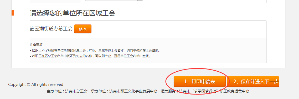 注意:再次确认本人单位所在区域(营业执照工商注册地)的工会组织,如有错误及时进行修改。