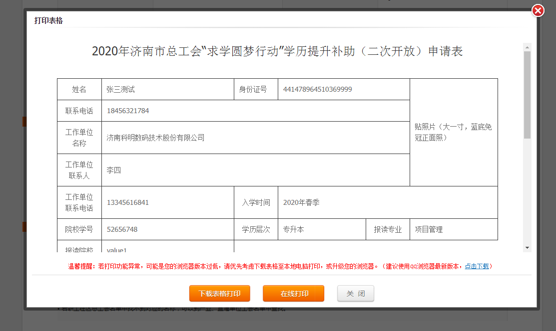 2、在线打印申请表。