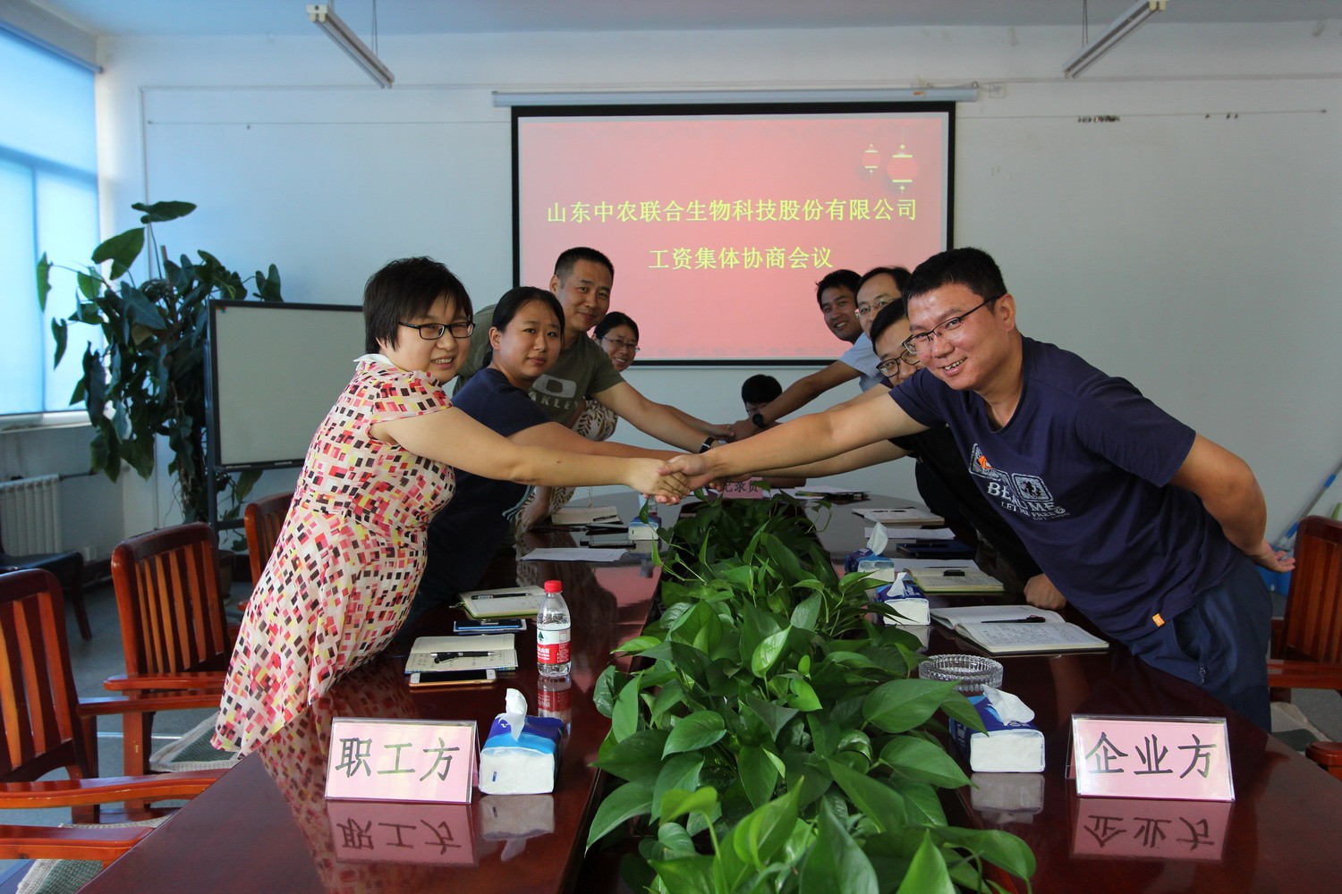 为建立企业和谐稳定的劳动关系,贯彻落实《山东省企业工资集体协商条例》,按照历城区总工会工作部署,山东中农联合生物科技股份有限公司近期开展工资集体协商工作,公司于8月1日在公司会议室召开协商会议,会上,职工方与企业方就员工最低工资标准,工资增长幅度,福利,员工餐补助等方面进行积极协商,取得良好效果。