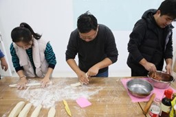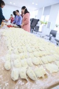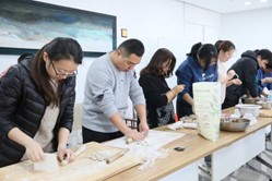 将近中午,表现真正技术的时候到啦!大家纷纷把各自精心准备好的馅料和饺子皮拿出来,调馅、和面、擀皮、包饺子,各部门分工明确,竞相“比赛”,现场一片热火朝天的景象。随着圆鼓鼓的饺子在大家熟练的动作下一个个呈现出来,这时不会包水饺的同事们可着了急,纷纷向身边的“小能手”同事学习包法,随后便热热闹闹地动手包起来。