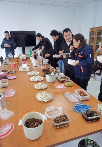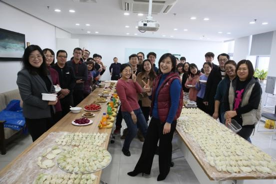 在欢声笑语中,各种馅料的饺子出炉了。等在旁边下水饺的同事们开始点火烧水,在蒸腾的热气中,热腾腾香气扑鼻的饺子出锅啦!大家迫不及待地品尝着自己亲手包的水饺,并通过视频连线两地办公区的同事,在分享展示各自“成果”的同时,也互相表达着祝福。鲜香的味道在舌尖绽放,声声的祝福在耳畔回响,真是让人格外满足!