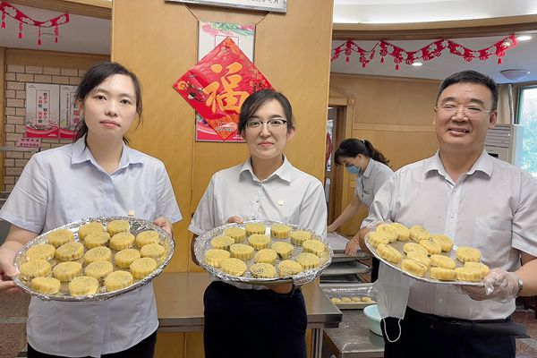 工作人员提前精心准备了各种馅料,有五仁、黑芝麻、蛋黄、豆沙等。大家欢聚一堂,在面点师的帮助指导下,一起揉面团、包馅、入模、压出成型,一个个圆圆地月饼制作完成,将自己心中美好的祝愿印制在月饼上。图案精美,满满成就感。大家做了近300个月饼,数量最多的前三名获奖。