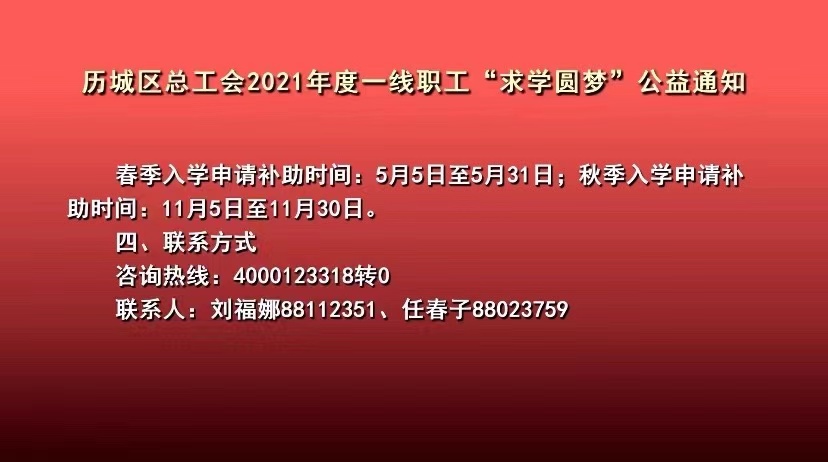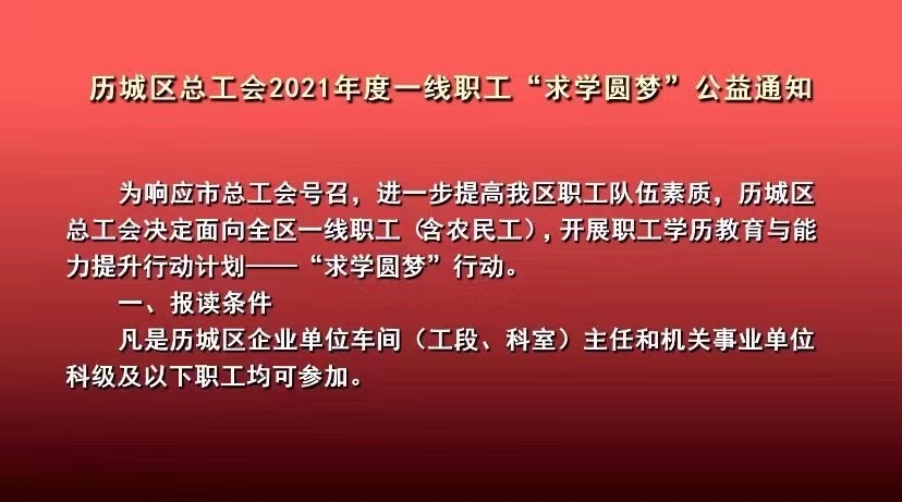 历城区总工会“求学圆梦行动”现正通过多渠道宣传推广,历城区总工会“求学圆梦行动”公益通知登上历城新闻频道播放。