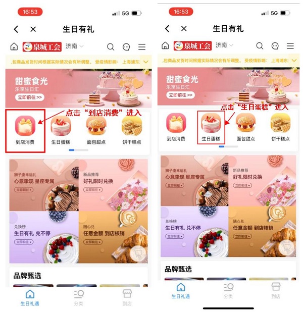 泉城工会“会员生日送蛋糕”活动自2021年8月上线以来,深受全市职工会员的欢迎与认可。在新年度的“会员生日送蛋糕”活动中,济南市总工会解锁生日福利新形式,开通线上蛋糕兑换平台——“生日有礼”版块。自2022年8月起,生日蛋糕中奖会员可以在“生日有礼”版块中自由选择蛋糕品牌、蛋糕样式、门店位置,以“到店消费”和“在线配送”两种形式皆可获得蛋糕。