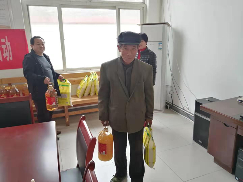 座谈会后,两家企业工会主席为村里贫困户送去食用油、大米等生活用品。