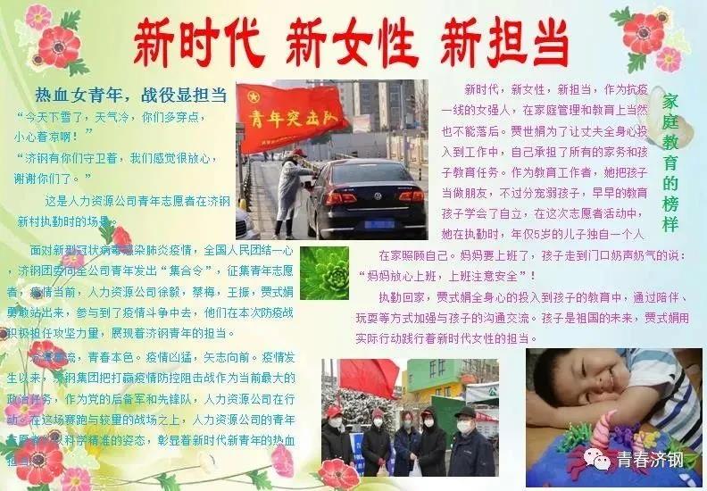 在新冠肺炎疫情防控取得阶段性成效、经济社会秩序逐步恢复正常的重要节点,我们迎来了第110个“三八”国际妇女节。全市各级工会及时挖掘、大力宣传在疫情防控工作中涌现出的先进女职工典型,激励广大女职工立足岗位,以实际行动在疫情防控和企业复工复产中展现巾帼作为,增强工会组织,特别是女职工组织的吸引力凝聚力战斗力。 长清区总工会推选20名女职委委员进行风采展示,激励广大女职工践行初心使命,为实现长清“四年大突破”贡献智慧和力量。 为了解企业复工复产后女职工的生产生活情况,开发区工会主席任新霞同志深入企业详细了解疫情期间一线女职工的在岗情况、工作内容、工资收入等生产、生活情况,为女职工送去节日的问候及口罩、医用酒精、84消毒液等防控物资和方便面等慰问物资,切实把“娘家人”的关心送到企业一线女职工身边。 平阴县总工会党组书记、常务副主席丁连宁一行先后来到面粉厂家属院、时代翰城小区走访慰问坚守在疫情防控一线的执勤女职工们,并为她们送去了节日的惊喜与亲切的祝福。安城镇总工会联合镇妇联组织70余名女性基层干部及部分巾帼志愿者,开展“巾帼不让须眉,红颜更胜儿郎”义务植树活动,让广大妇女同志度过了一个特别的妇女节。此次活动,增强了大家植树造林的绿化意识,树立和践行了“绿水青山就是金山银山”的发展理念。 济钢集团公司工会评选表彰了先进女职工集体和个人,女职工委员会开展“展风采,建新功”系列活动。各基层工会积极开展了“自制美食才艺大比”、“网络才艺大比拼”,制作疫情防控手抄报,“最美巾帼逆行者”征文,“三八节”女工干部微信沟通交流会、“书香三八”征文、“一封家书”“摄影作品征集”等系列活动。 元首公司工会结合当前疫情防控形势,开展“疫情当前·巾帼担当”献礼“三八”节主题活动,用诗歌诵读最可爱的人。此次活动得到了相关分会的大力支持和女职工的积极参与,大家通过视频、图片、黑板报、诗歌等形式,展现了疫情期间奋战在企业各条战线上的女职工的良好精神风貌。 济南热力集团工会组织开展如何做好女职工相关工作提出合理化建议及“舌尖上的热力”厨艺大赛活动。此次疫情期间的三八节活动,结合传统节日节气营造良好的节日氛围,结合集团公司“四五六六”企业文化法则,为集团女职工提供一个陶冶情操、放松身心、增进友谊的平台,活跃女工的业余文化生活,增强女工的凝聚力,把疫情防护温馨提示、节日祝福、免疫力增强与厨艺展示等内容有机融合,制作成特别的食物推送给防疫人员,传递温暖和信心。 济南热电有限公司举办了“凝聚巾帼力量 携手抗击疫情 我们在一起”网络作品征集比赛活动。公司机关及所属各分公司快速响应,组织女职工积极踊跃参加,公司工会共收到视频、书法、绘画和征文等各类作品80个。视频内容丰富多样,岗位的坚守、抗击疫情的感悟、诱人的美食制作、诗朗诵舞蹈才艺、诗歌散文创作,充分展示了热电职工齐心协力抗击疫情的决心和感悟,积极向上的生活态度。