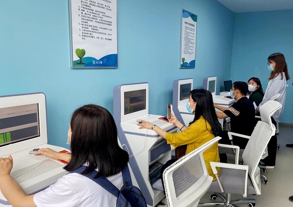在心理测评室,职工用齐鲁工惠账号登录专业设备,自助评估精神健康状态,检测完成之后,报告可以即时打印,也可以实时推送到手机端。