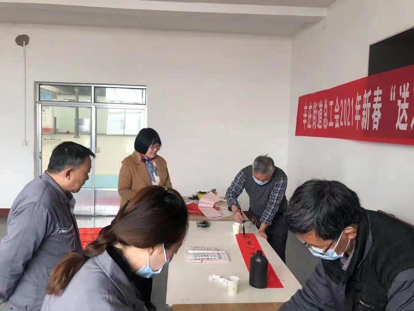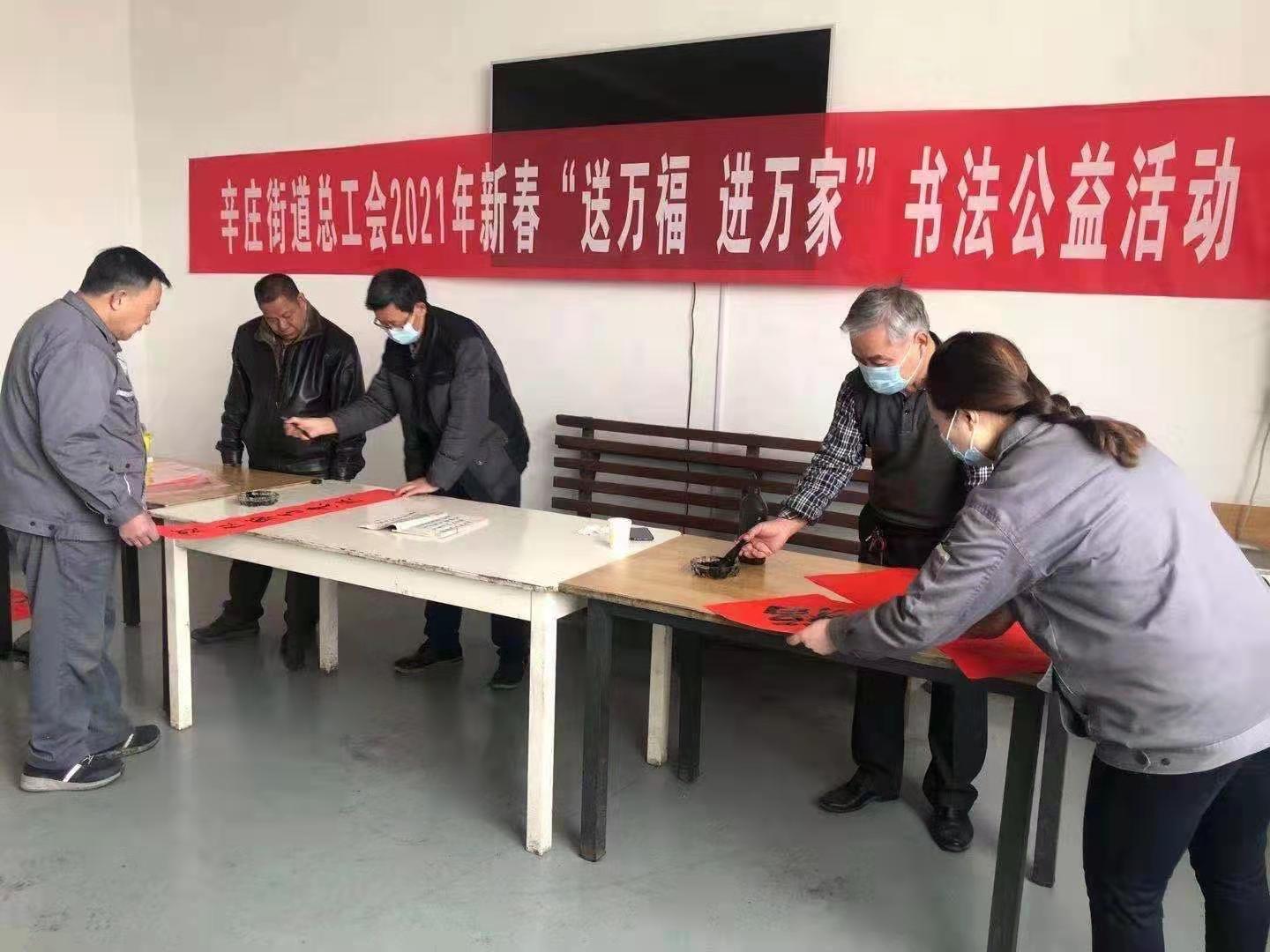 新年将至,为营造浓厚的节日氛围,弘扬中华传统文化魅力,丰富广大人民群众的精神文化生活,2月5日,辛庄街道总工会到莱芜福泰机械有限公司开展“送万福 进万家”书法公益活动,写“福”字、送春联,为职工、农民工送上新年祝福。