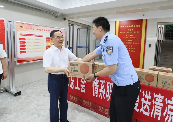 在历下交警大队奥运片区中队,吕灿华详细询问交警勤务保障、安全防护等情况,向交警干部职工表示亲切的问候和衷心的感谢,并为他们送上防暑降温物品。他指出,交警作为城市交通秩序的守护者,无论烈日风雨,始终坚守岗位,履职尽责,默默奉献,为我市经济社会发展和人民群众平安畅通出行作出了积极贡献。工会组织作为职工“娘家人”,要关心关爱、切实维护好他们的安全健康权益,加强对一线交警的劳动保护,把防暑降温工作落到实处。