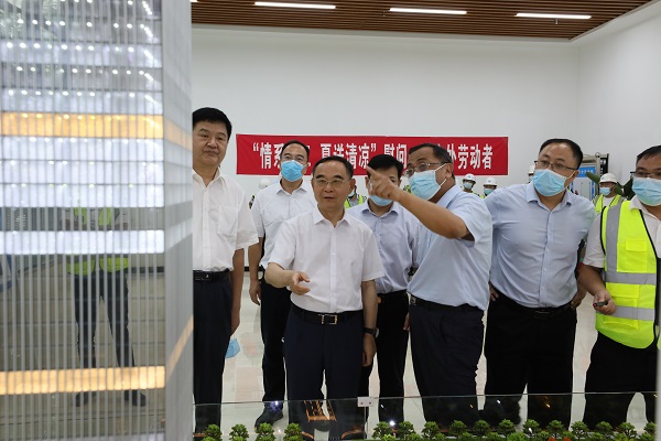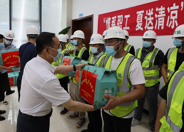 随后,吕灿华一行到历下区CBD中央广场项目工地,看望慰问项目参建职工,为他们送上防暑降温物品。吕灿华强调,开展“夏送清凉”活动,是工会竭诚服务职工,特别是奋战在高温一线户外劳动者的职责所在。他向参建职工表达了亲切的问候,对他们不畏高温、勤勤恳恳的工作表示感谢,并叮嘱他们要增强自我保护意识,注意劳逸结合,确保高温季节的生产安全和身体健康,立足本职岗位,不断提升技能,以优异成绩迎接党的二十大胜利召开。