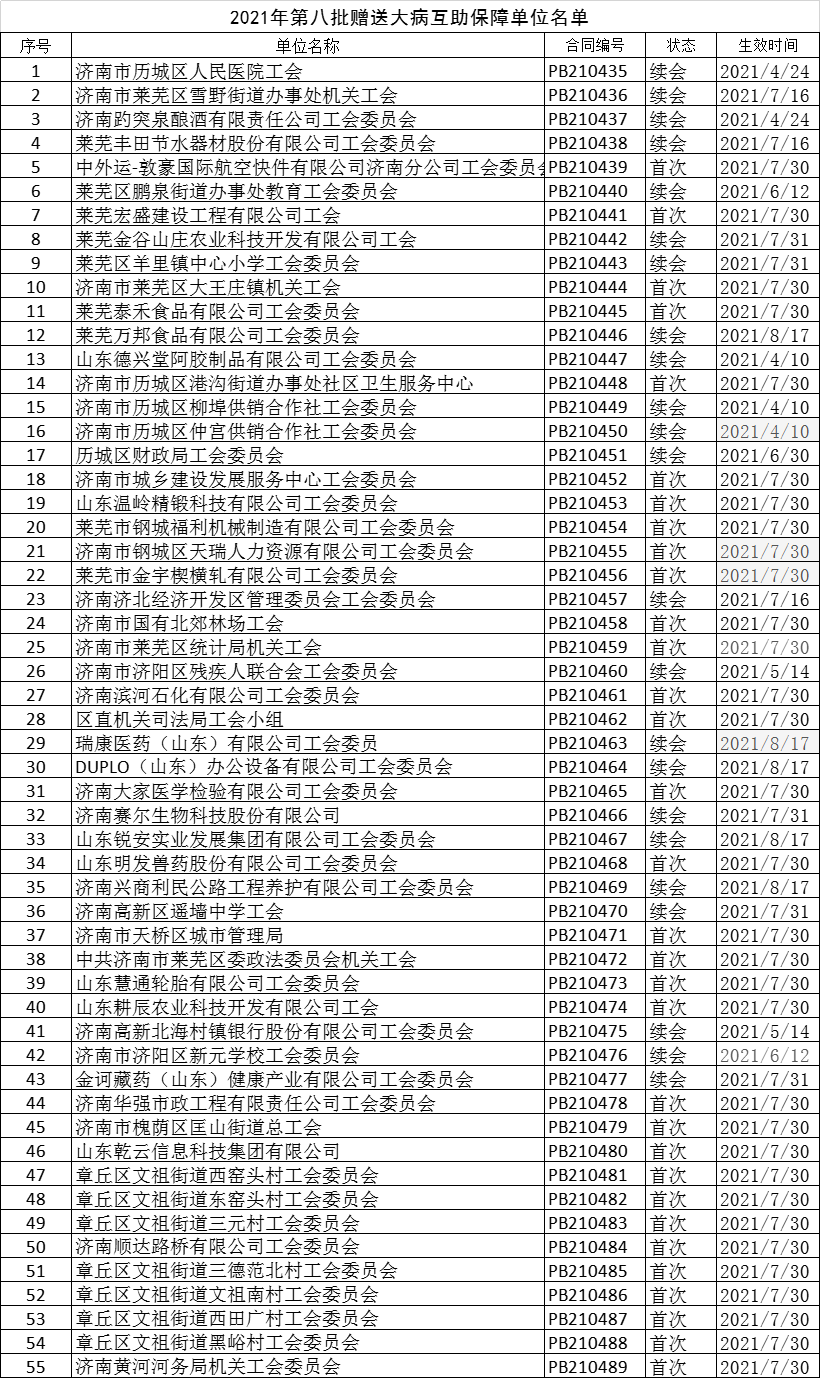 各基层单位: 市总工会2021年第八批赠送的大病互助保障单位名单公布如下(详见附件),请及时关注查看详细信息。 备注:以下单位的会员可登录齐鲁工惠APP-互助保障-保单查询模块查看保单信息。 济南市总工会 2021年8月2日
