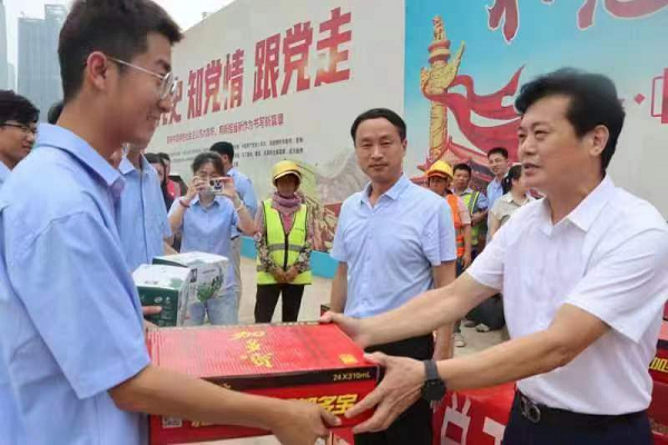 7月11日下午,济南市总工会党组成员、副主席蒲玉全,党组成员、机关党委书记郝敏一行到中建五局山东公司中信泰富中央商务区A1地块330米超高层项目开展“情系职工·夏送清凉”慰问活动。