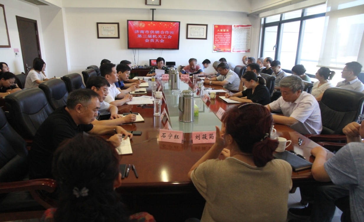 近日, 市供销社召开第三届机关工会会员大会。市社党组书记、理事会主任张国松同志出席会议并讲话;党组副书记、机关党委书记黄波同志致辞;党组成员、监事会副主任亓明同志主持会议, 王红岩同志代表上届工会委员会作工作报告,市社机关全体会员参会。