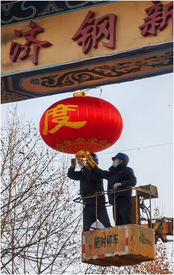 近日,济钢集团职工在鲍山社区内悬挂彩灯和灯笼,火红的颜色烘托起春节的氛围。
