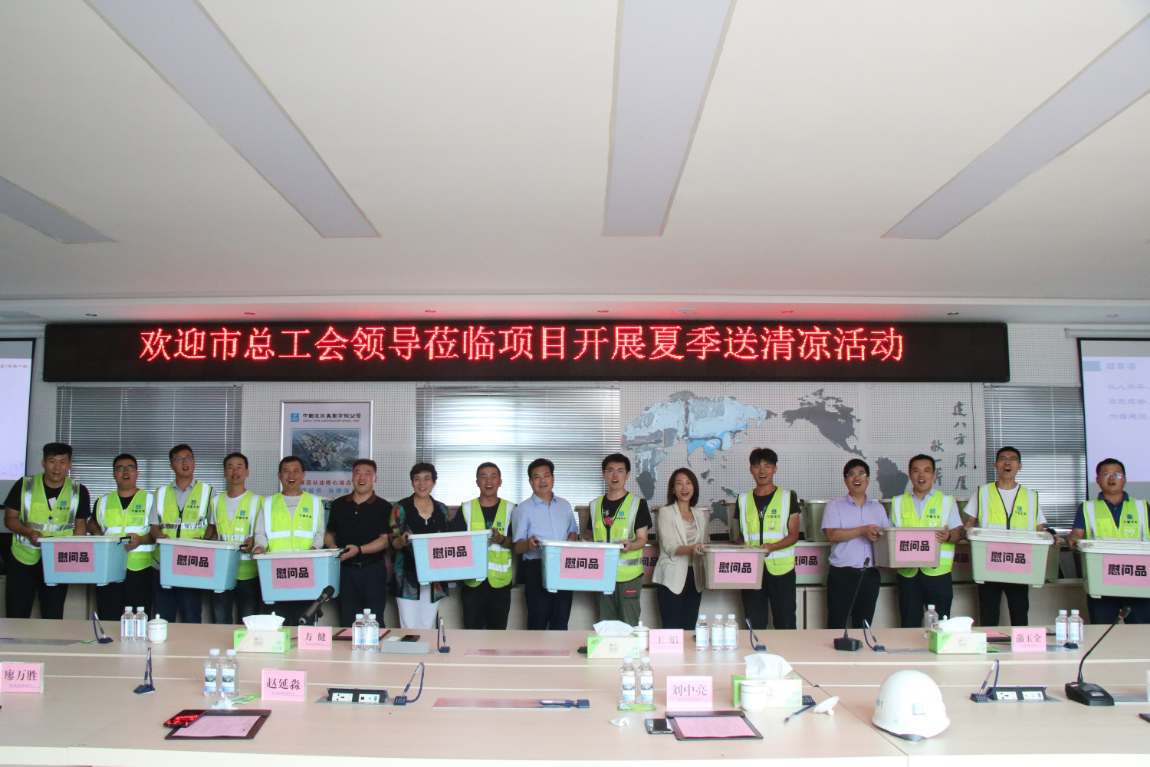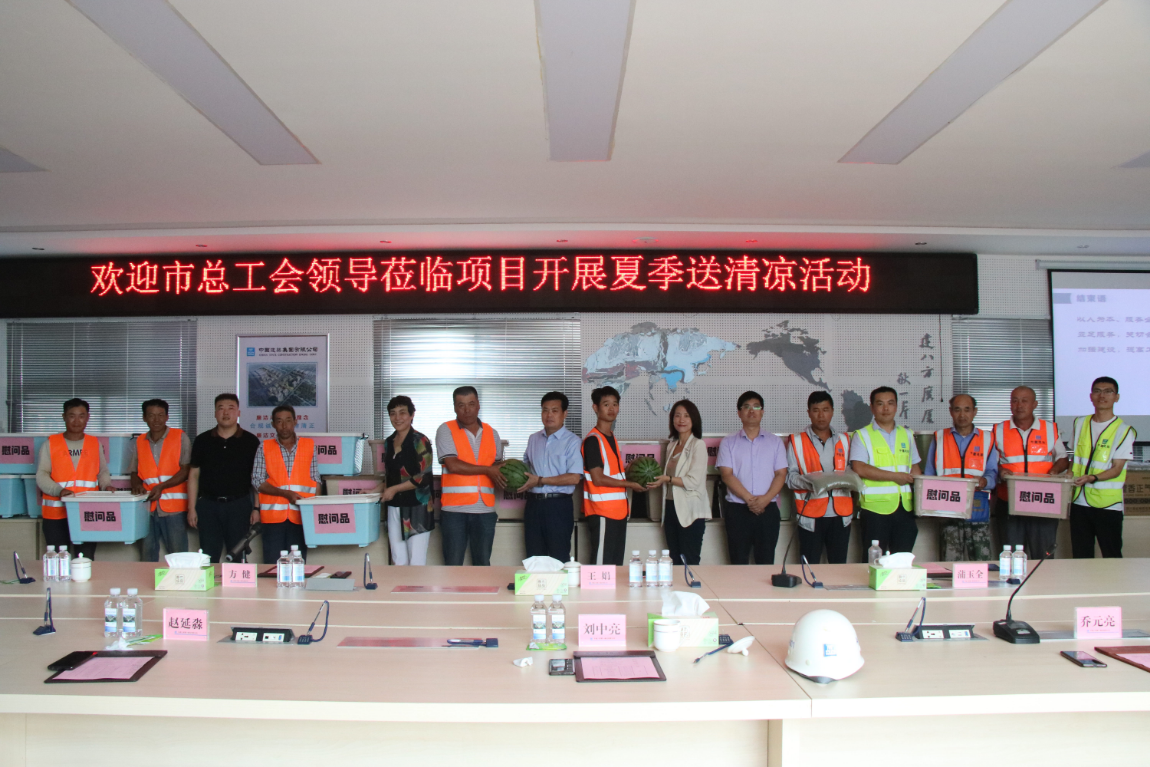 为做好防暑降温工作,确保职工身体健康、平安度夏,2020年7月21日,济南市总工会一行到先行区数字经济产业园项目开展了夏送清凉活动,济南市总工会副主席蒲玉全,济南市总工会直属工会主任王娟,中建八局一公司党委副书记、工会主席刘文纳,中建八局一公司济南公司副总工程师乔元亮以及项目部全体成员及工人代表参加了此次活动,活动由中建八局一公司工会工作部部长方健主持。 考察项目建设现场 蒲主席一行来到项目部,首先对项目现场形象进度进行了考察,对项目大干快上的施工节奏表示满意;紧接着,全体活动人员来到项目会议室,首先由项目经理刘中亮针对项目管理办法,管理过程,管理成果进行了汇报;紧接着,工会领导对一线员工及项目成员进行了深切的关怀,从工人兄弟那了解到,项目在衣食住行方面提供了非常多的便利,并在项目上提供了诸多娱乐资源,举办了多种多样的娱乐活动,让身在远方的他们让他们感觉到了家的温暖;接下来,市总工会为工友同志及项目管理人员发放了夏送清凉慰问品,蒲玉全等亲切慰问了一线工人的工作情况,叮嘱他们多喝水,注意防暑,保证身体不掉队,合理安排工作时间。 现场交流 发放清凉慰问品 最后,由蒲玉全、刘文纳分别代表市总工会以及公司工会对本次活动的初衷、意义进行了总结发言,对生产人员的无私付出表示衷心的感谢,并表示一定将工友同志及公司员工提出的意见和建议当成工作重点,着力解决。 乔元亮表示,先行区数字经济产业园项目是济南先行区成立以来第一个公投工建项目,在建设一线一直奉献着自己的力量。在疫情期间,我们驰援武汉,援建济宁;在复工复产阶段,我们积极组织人力物力,快速生产;在各种危难关头彰显着企业实力,践行着企业担当。生产期间,我们关爱员工,照顾工人,我们有义务也有能力将此项工作做好,并且类似此类活动我们会经常组织,不断让工人同志以及企业员工感受到中建八一这个大家庭的温暖。