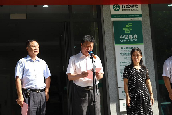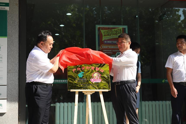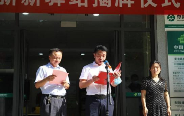 区委组织部副部长张卫兵,济南市邮政分公司副总经理、工会主席时洪俭共同为新新驿站揭牌。